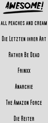 Hier sind nicht alle Filme aufgelistet, an denen wir bis heute gearbeitet haben. Diese, die fehlen, tun dies natürlich aus einem guten Grund. Entweder gibt es einfach zu wenig zeigbares Material oder wir (und damit bin in erster Linie ich, der Regisseur, gemeint) schämen uns für die Filme in Grund und Boden. Und wenn man bedenkt, dass "all peaches and cream" noch aufgelistet ist, heißt das schon einiges!